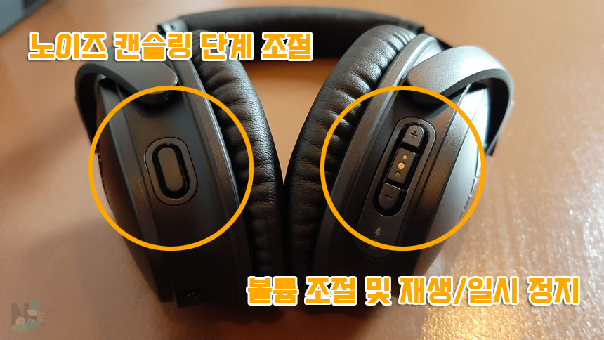헤드폰을 사용하면서 간단한 조작을 할 수 있는 버튼이 양쪽에 각각 있습니다. 왼쪽의 버튼으로는 노이즈 캔슬링의 단계를 조절하거나(높음, 낮음 두 단계) 노이즈 캔슬링 기능을 아예 끌 수도 있습니다.