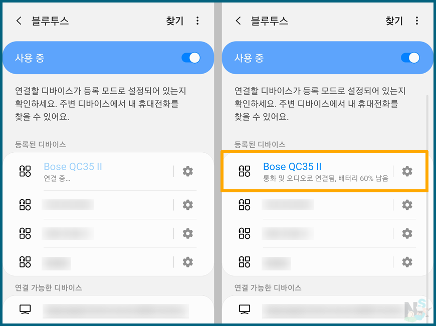 스마트폰 블루투스 설정에서 보스 QC35 2를 찾아 연결하면 헤드폰의 잔여 배터리까지 확인할 수 있습니다. 다른 헤드폰에 비해 보스 QC35 2가 가지고 있는 또 하나의 장점은 멀티 페어링이 가능하다는 점인데요, 스마트폰, 노트북 등의 기기들과 동시 연결이 가능해서 따로 연결을 관리하지 않아도 자유롭게 여러 기기들을 오가며 사용할 수 있습니다.