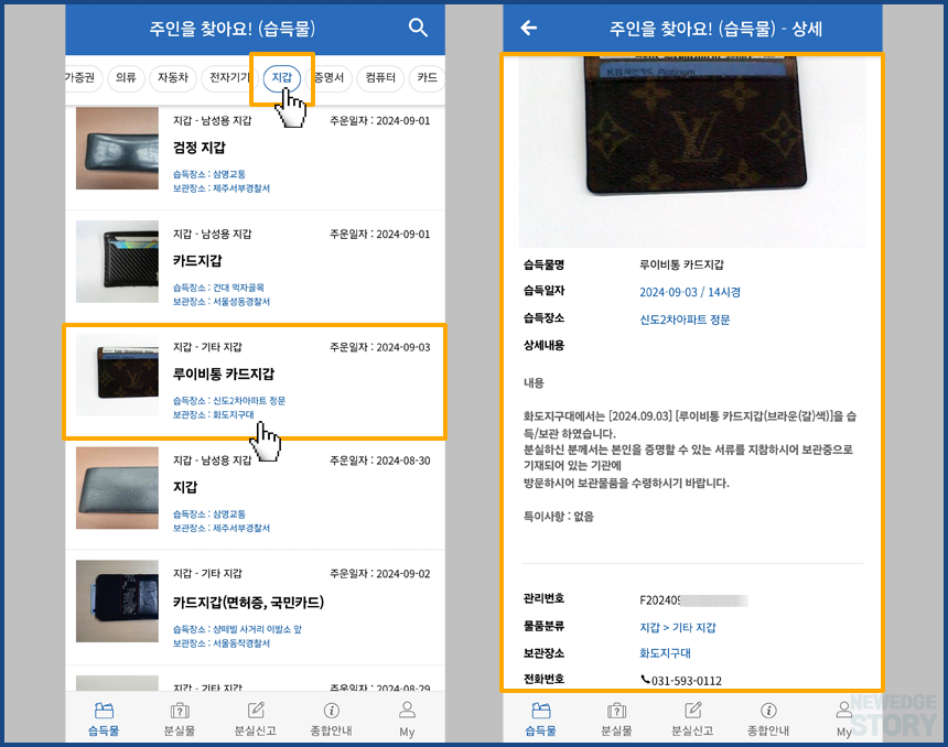 목록에 표시된 지갑을 선택하면 상세 정보를 볼 수 있습니다. 습득 일자, 지역 및 장소, 지갑의 브랜드, 색깔, 들어 있던 내용물 등을 확인해서 내 지갑인 것 같은 경우에 해당 보관 장소에 연락하거나 방문하면 됩니다.
